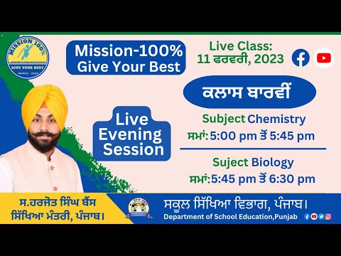 “Mission 100%: Give Your Best” ਮੁਹਿੰਮ ਤਹਿਤ ਮਾਣਯੋਗ ਸਿੱਖਿਆ ਮੰਤਰੀ ਪੰਜਾਬ ਸ. ਹਰਜੋਤ ਸਿੰਘ ਬੈਂਸ Harjot Singh Bains ਜੀ ਦੀ ਅਗਵਾਈ ਹੇਠ ਮਿਤੀ: 11/02/2023 ਨੂੰ ਸ਼ਾਮ ਦੇ ਸੈਸ਼ਨ ਦੌਰਾਨ Facebook ਅਤੇ YouTube ਤੇ ਲਗਾਈਆਂ ਜਾਣ ਵਾਲੀਆਂ ਆਨਲਾਈਨ ਕਲਾਸਾਂ ਦਾ ਵੇਰਵਾ: